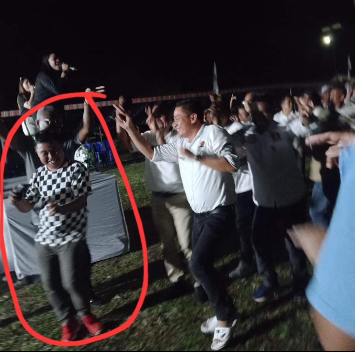 Yeri Nangalo, ASN jajaran Pemkab Talaud (lingkar merah) terlihat asik ‘bagoyang’ di depan Paslon IH dan pendukung yang juga terlihat sementara ‘bagoyang’; di Kampanye IH-HM di Desa Bulude, Kecamatan Essang.