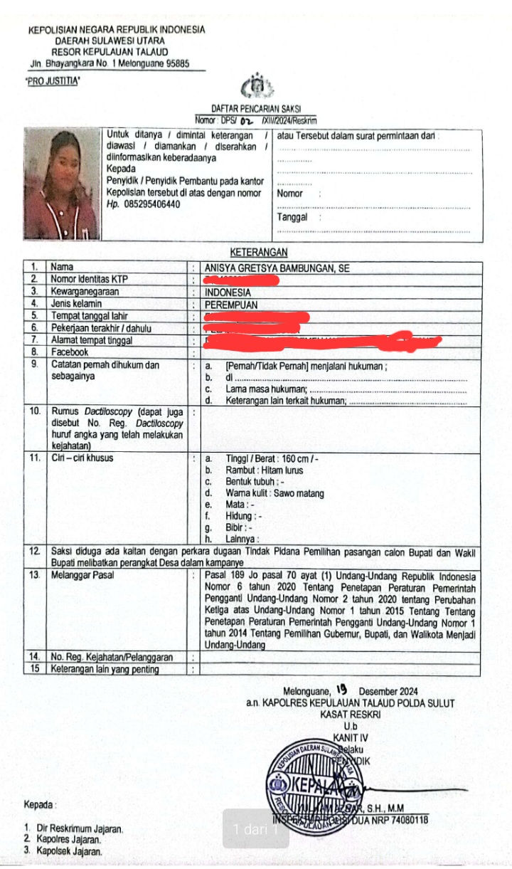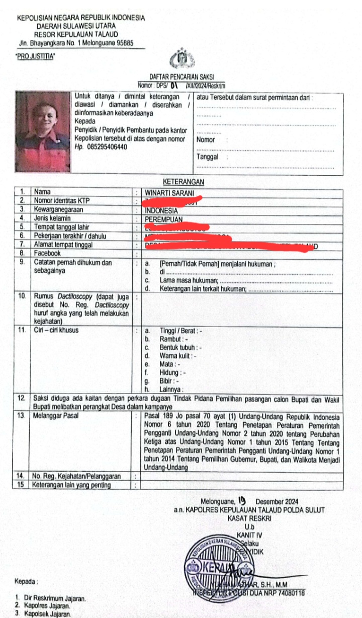 Hal ini sesuai dengan keluarnya Daftar Pencarian Saksi (DPS) Nomor: DPS/02/XII/2024/Reskrim atas nama AGB yang dikeluarkan Polres Kepulauan Talaud, tertanggal 19 Desember 2024. Dimana, DPS ini mulai beredar terutama di media sosial (medsos), sejak Sabtu (21/12/2024) malam.