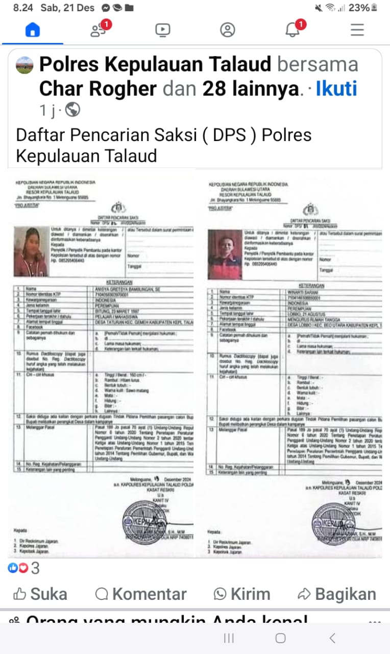 Postingan DPS di facebook oleh akun Polres Kepulauan Talaud, pada Sabtu (21/13/2024) malam.